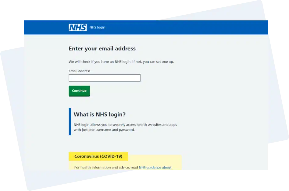 On the login page, click on the “Log in with NHS login” button to be redirected to the NHS website. Alternatively, continue to NHS login by clicking the button below:
